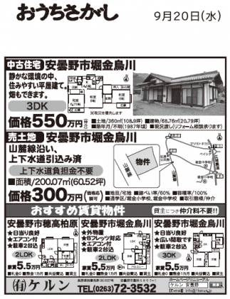 2017年09月19日 信濃毎日新聞広告 明日の折り込み広告「おうちさがし」に 弊社の広告が掲載されます 大変申し訳ありません。 最上欄の中古住宅物件は、最近申し込みがあり商談中になっています。 その他安曇野市堀金烏川の土地情報がありますので お問い合わせください 前の記事へ 次の記事へ